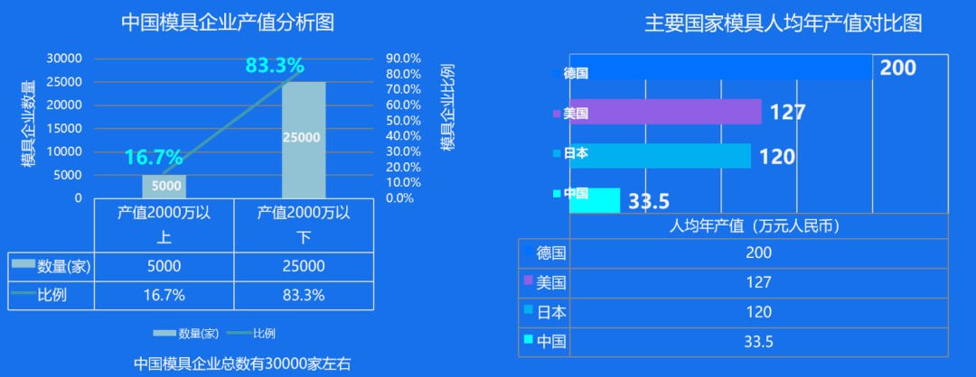 目前中国注册在案的模具企业大概有30000家,去年的产值有3000多亿,全球产值超近万亿。